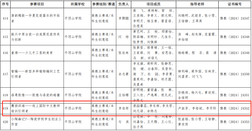 近日,河南省教育厅公布了2024年河南省大学生创新大赛暨中国国际大学生创新大赛河南赛区选拔赛获奖名单,由威尼斯电子游戏大厅卢淑芳,李培斌,李丹阳老师指导,青鸢国际中文教育团队学生李佳雨主持的项目《鹰扬四海——线上国际中文教师培训引领者》获三等奖。
