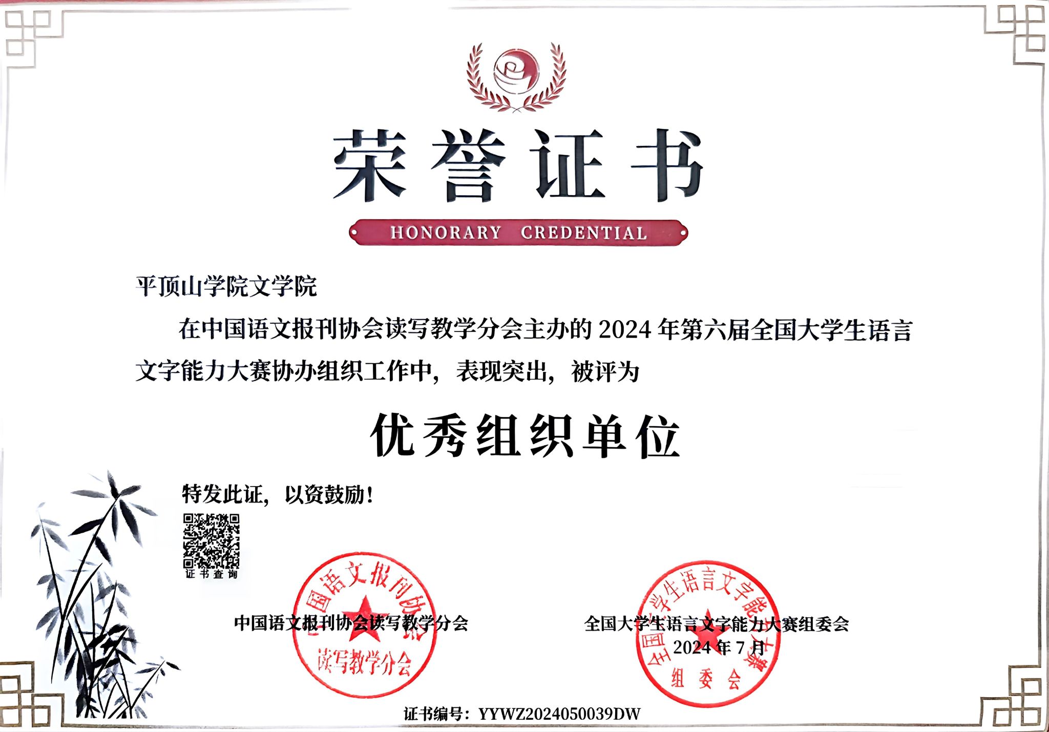 威尼斯电子游戏大厅——2024年第六届全国大学生语言文字能力大赛优秀组织单位